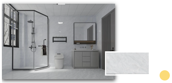 安道爾橙格柵背景+水云灰通體瓷拋石中板的溫暖搭配,令一個舒適的浴室環境躍然而上。扇形的鏡面設計配以及暖色調條形燈,不僅契合當下年輕人的空間審美,更煥發出不一樣的青春活力。