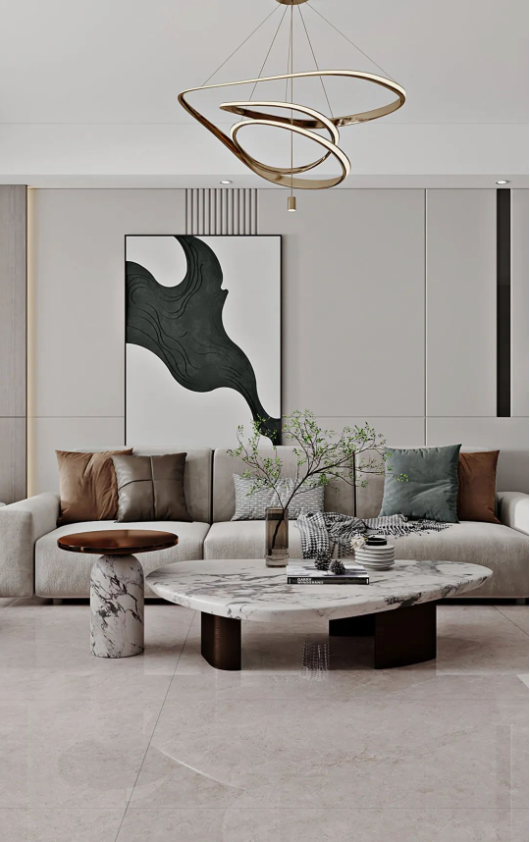 地面的主角哈爾施灰,飄逸的紋理,如無拘無束的靈魂,隨性優雅。深淺不一的自然過渡,配合頗具檔次的不規則燈具、絨布沙發以及大膽有趣的抽象畫,讓空間充滿時尚,不落俗套。