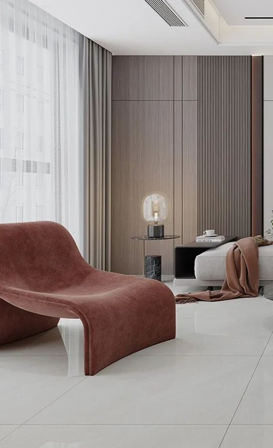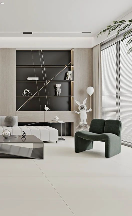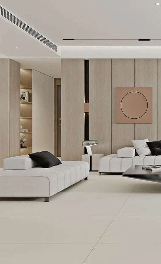 無主燈的天花設計+溫潤氣質的木飾墻面,搭配600X1200mm廣寒秋進行地面通鋪,細微呵護的親膚觸感,方寸之間為你找回久違的愜意和寧靜,讓空間充滿舒適氣息。