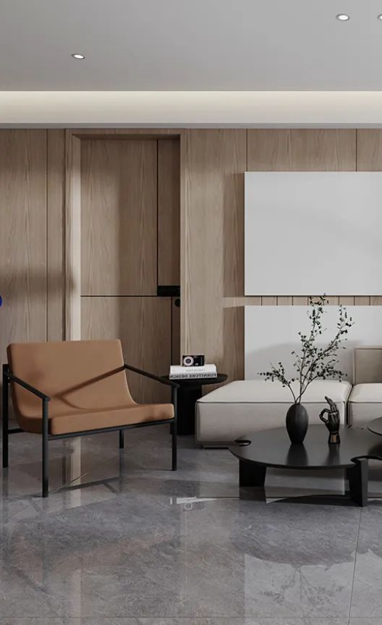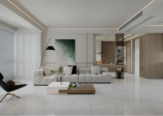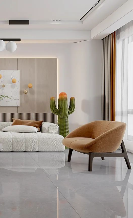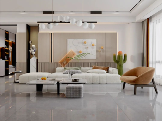 900X1800mm哈瓦蘇大面積地延伸于空間,石材自然的肌理,流暢的紋路,給人大自然的親近之感,開闊空間及通透陽光磨合了留白帶來的空洞感,木紋與綠色的點綴溫和治愈之余讓空間富有活力。