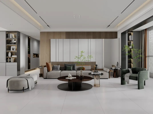 地面采用滿(mǎn)庭芳,表面質(zhì)地柔和,淡淡灰色搭配木質(zhì)背景墻及綠植元素,仿佛被輕紗籠罩,細(xì)膩的紋理和微妙的陰影效果,潔凈無(wú)雜質(zhì),800X800mm經(jīng)典規(guī)格通鋪客廳,清新淡雅中營(yíng)造出質(zhì)樸又高級(jí)的空間氛圍。